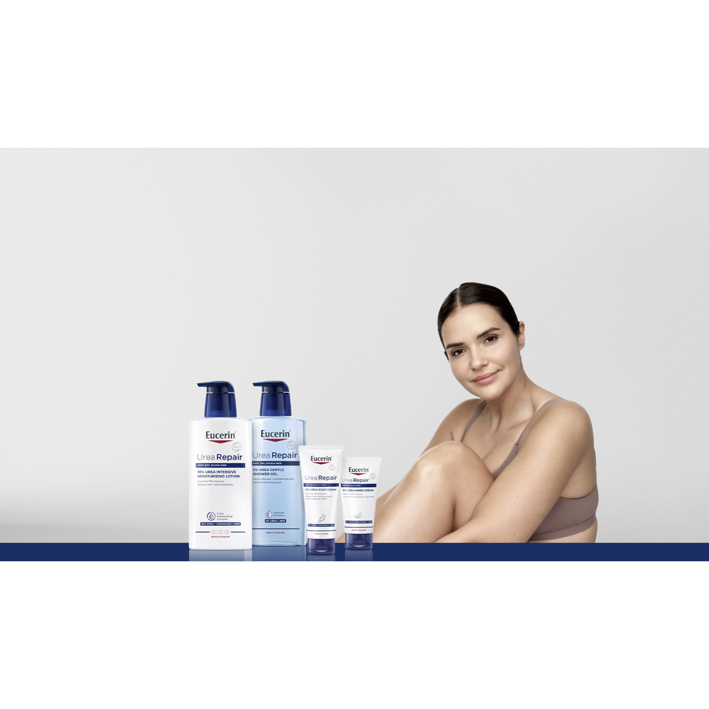 Eucerin UreaRepair PLUS offre une gamme complète de produits qui comprend un gel nettoyant, des émollients et des crèmes pour le corps (y compris des produits de soins pour les mains et les pieds) et une crème de traitement intensif pour les zones à problèmes de peau extrêmement sèche.
