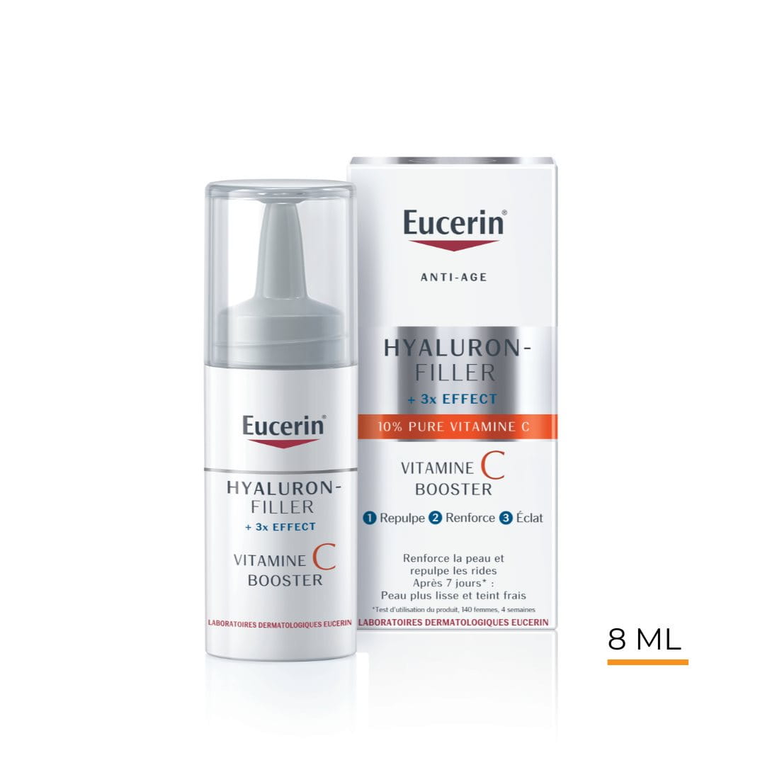 Eucerin HYALURON-FILLER + 3x EFFECT VITAMINE C BOOSTER apporte des bénéfices antioxydants et boosters de collagène, grâce aux 10 % de vitamine C pure et fraîchement activée. Il contient également de l’Acide Hyaluronique de bas poids moléculaire. Il a fait l’objet de tests cliniques et dermatologiques qui ont prouvé qu’il renforçait la peau, comblait les rides et procurait une peau plus lisse, plus fraiche et plus éclatante en sept jours seulement, avec des résultats s’améliorant de jour en jour. Il peut être utilisé seul comme booster servant à combattre les premiers signes de l’âge, même si nous vous recommandons de l’associer à une crème de jour Eucerin HYALURON-FILLER + 3x EFFECT comme : Eucerin HYALURON-FILLER + 3x EFFECT Soin de jour SPF 15, Eucerin HYALURON-FILLER + 3x EFFECT Soin de jour SPF 30, Eucerin HYALURON-FILLER CC Cream SPF 15 Light ou Eucerin HYALURON-FILLER CC Cream SPF 15 Medium.