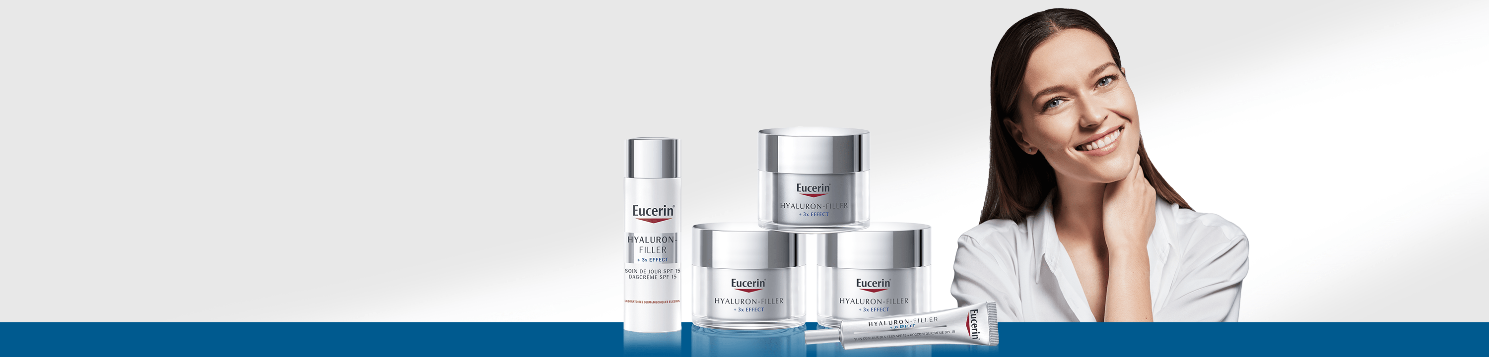 La gamme Eucerin HYALURON-FILLER + 3x EFFECT, a été spécialement formulée pour contrer le processus de vieillissement cutané, cette gamme propose une triple action ciblée :